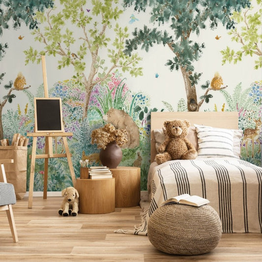 Go for a classic woodland theme- Woodland themed animal wallpapers are perfect for creating a relaxed and charming feel. Featuring woodland animals, wild leaves and trees, the whimsical wallpaper are perfect for using on feature walls or displaying throughout an entire room. A favourite of ours here at DCO is the Woodland Animal Wallpaper.