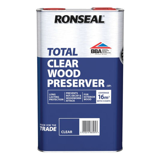 A solvent based and traditional wood preserver, this professional Ronseal wood preserver protects wood against decay, rot and wood discolouring fungi. Delivering long lasting protection, Ronseal Trade Total Wood Preserver is suitable for using on exterior wooden surfaces including joists, window frames, doors, sheds and fences.
