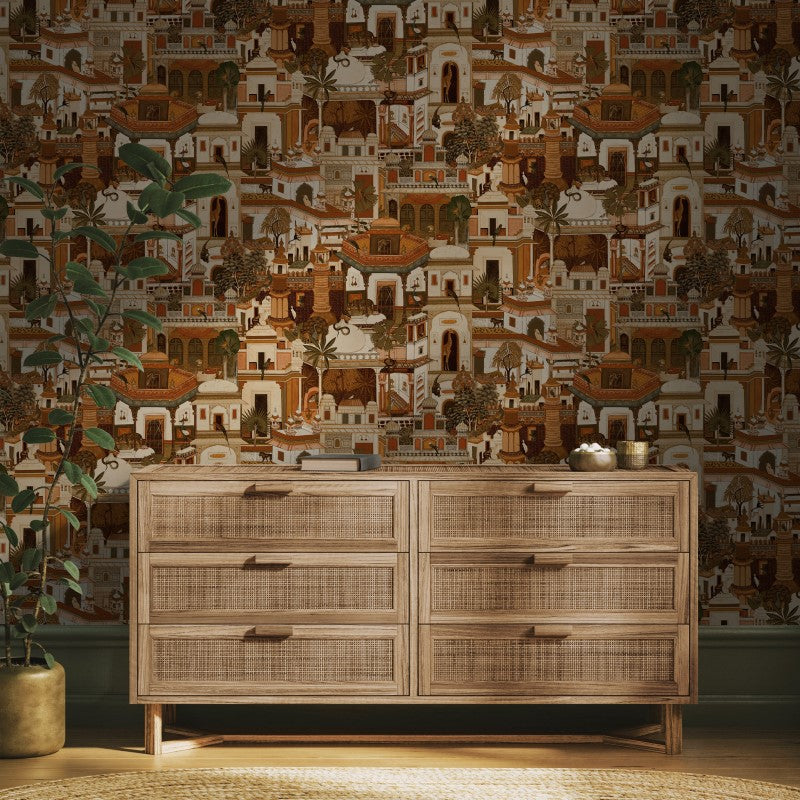 Featuring an architectural design based around a busy Moroccan city, jungle animals peep out of doors and windows adding a quirky fun element to this beautifully detailed patterned. Providing an eye catching and quirky addition to any room in your home, we can imagine this playful design being used in a contemporary living room, bedroom, office, or even stylish kids playroom. Display this paste the wall wallpaper throughout an entire space, or use it on an eye catching feature wall to create an instant wow factor for your family and guests.