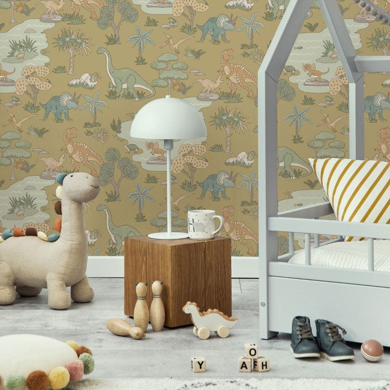 To add even more vibrancy, the pattern includes leafy trees and tropical plants, giving the wallpaper a fresh and energetic feel. Available in a range of colourways to suit your style, including cream, green, pink, and ochre, this versatile design is an ideal choice for nurseries, bedrooms, or play areas.