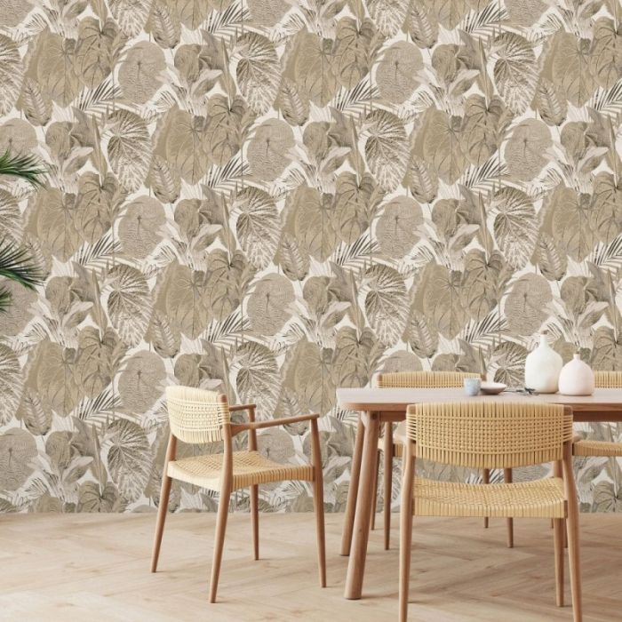 Featuring a variety of tropical leaves, this AS Creation wallpaper is ideal for a creating a statement feature wall, pairing with another papers, or running throughout a room for maximum impact. Adding a touch of tropical charm to your home, this leaf wallpaper would make the perfect addition to a calm bedroom or on trend living space to help create a fresh and sophisticated vibe. Available in two stylish colourways, green and taupe to suit your interior style, we think this tropical wallpaper would look beautifully styled with wooden furniture and neutral coloured accessories.