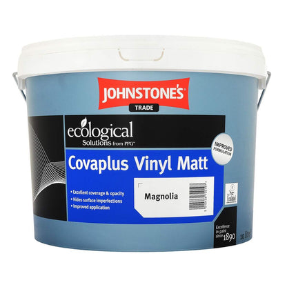 Recoatable in 2-4 hours, this Johnstone's Trade Covaplus Vinyl Matt is touch dry in 1-2 hours and covers approximately 17m² per Litre. Is available in Brilliant White & Magnolia (10L Only)