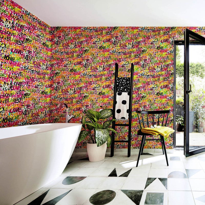 This scribble wallpaper makes the bold statement that anyone is welcome into the warm fold of your nurturing space – friend, stranger, and everything in between. We could all do with the reminder that love really is the universal language, and Love Scribble speaks volumes with just one doting word. The crafty and down-to-the-earth pattern is available in Multi Riot, Pop Riot, Polished Cement, Pastel Pop, and Aquamarine.