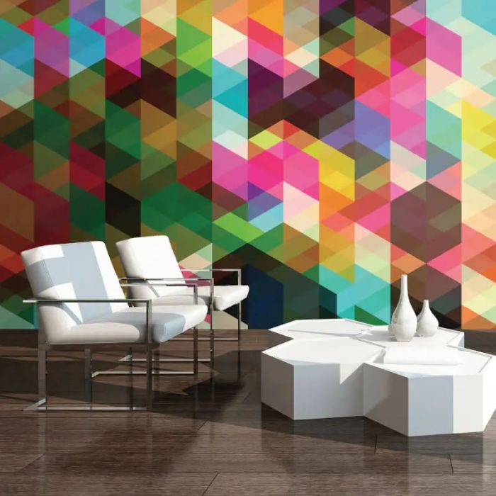 Featuring an array of vibrant and contemporary colours amongst a geometric diamond pattern, this design will bring much needed colour and wow-factor to any space it is placed in. A great choice for a bedroom, children's playroom or inspiring office space, this intriguing design is sure to provide your family and guests with a never-ending fascination with its detail and colour. The ideal choice for creating a bold feature wall, this statement wall mural will transform your space in a unique way effortlessly modernising your room. Available in two wallpaper sizes medium and large, this mural wallpaper is easy to apply to your walls through a paste the wall application.
