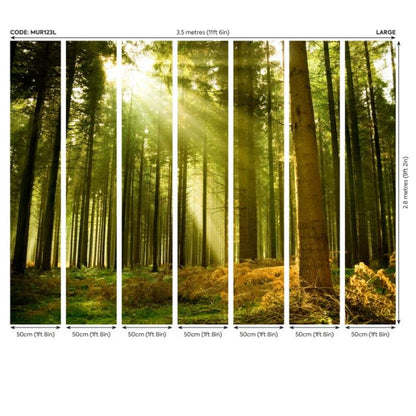 Featuring an image of early morning sunlight filtering through a forest of spruce trees, this stunning green mural wallpaper will effortlessly add light and beauty into your surroundings. Suitable for fitting in perfectly with a range of colour schemes, we think this statement non-woven design would look wonderfully styled with soft and natural tones encouraging a peaceful and relaxed vibe in your living room, bedroom or home office.