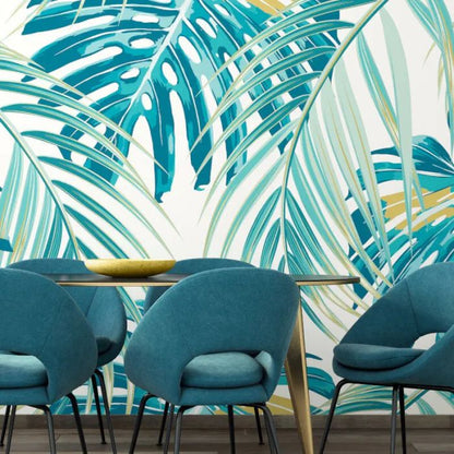 Add a touch of tropical paradise to your interiors with the Origin tropical leaves wall mural in teal.