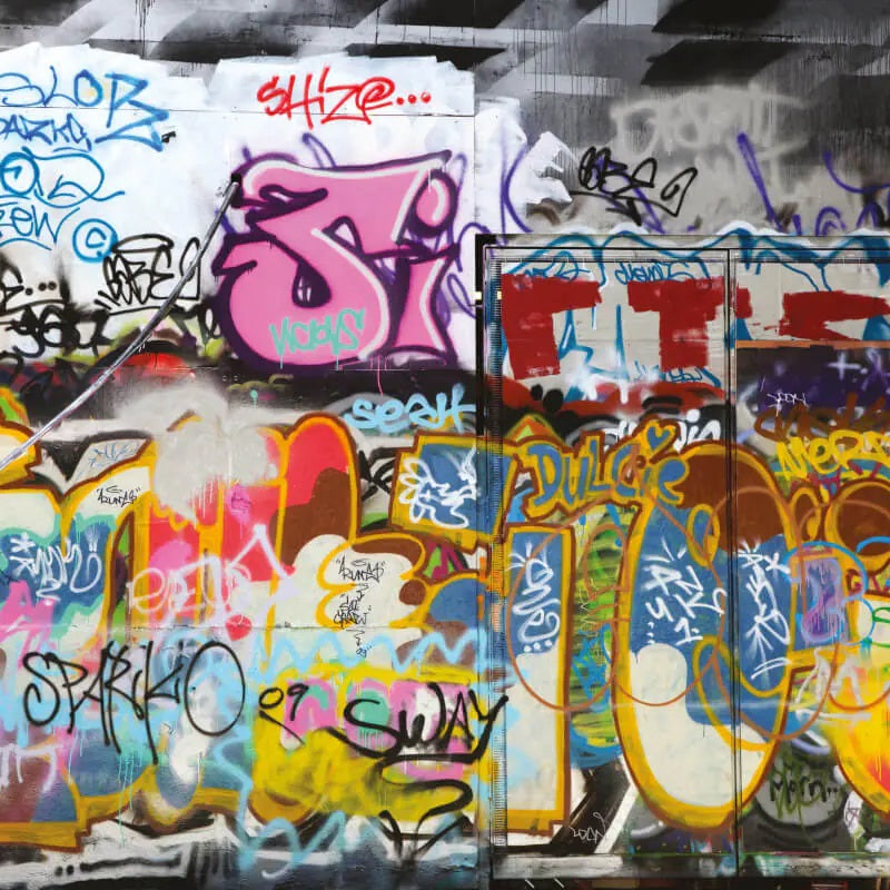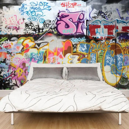 Create an effortlessly cool feature wall in your home with this multi-coloured Origin urban graffiti wallpaper mural.