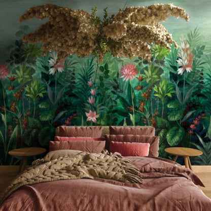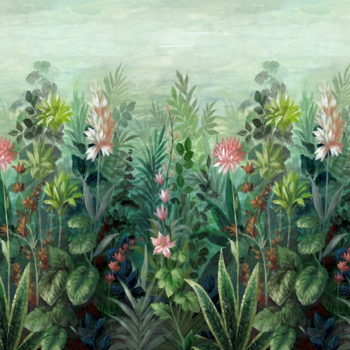Bursting with botanical flare, this lush wallpaper design features a wonderful botanical landscape including a host of green foliage and delicate pink florals providing a beautiful burst of colour throughout the design.