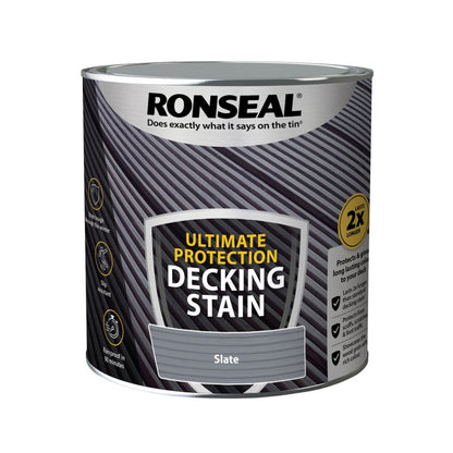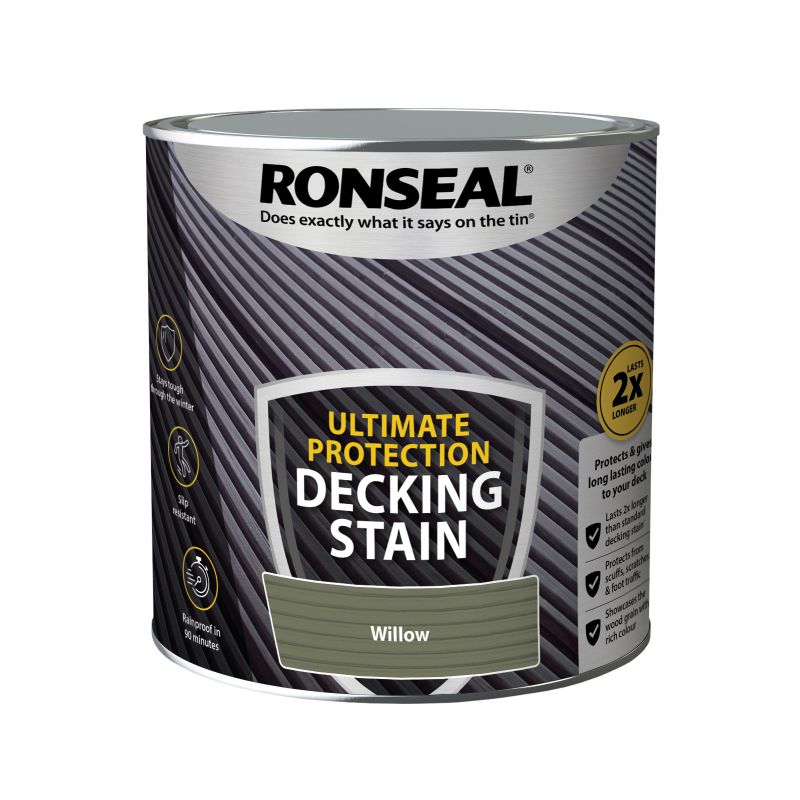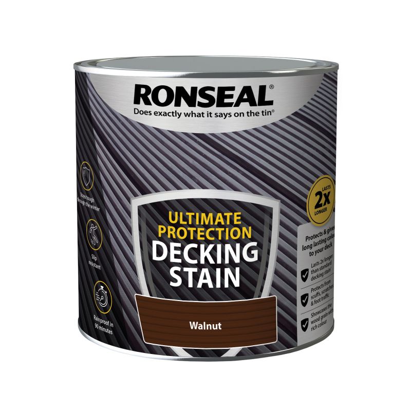 Based on weathering data, Ronseal Ultimate Protection Decking Stain lasts twice as long as a standard decking stain. Ronseal Ultimate Decking Stain is slip resistant and will be rainproof in 90 minutes.