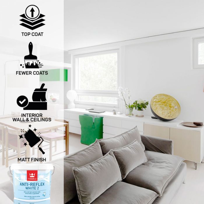 Anti Reflex Paint A high-opacity and flat matt paint, Tikkurila Anti Reflex 2 is ideal for using on interior walls & ceilings. Suitable for applying through spray, brush, or roller, Anti Reflex White 2 is ultra low VOC...