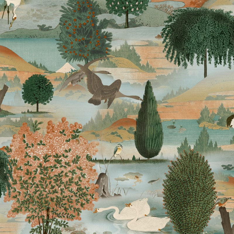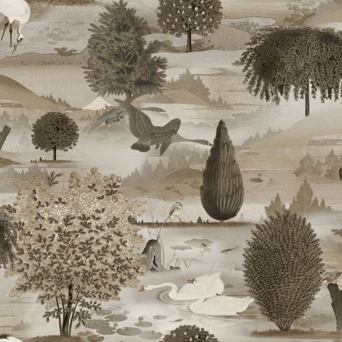 Featuring a stunning scenic landscape with an atmospheric misty haze sweeping across the hills and an array of beautiful swans and birds, this wonderful wallpaper is sure to create an instant impact. Perfect for those who like a more maximalist style, this unique design will impress in most spaces such as the living room, bedroom or dining room.