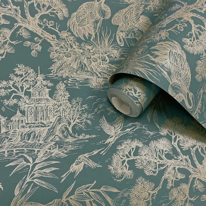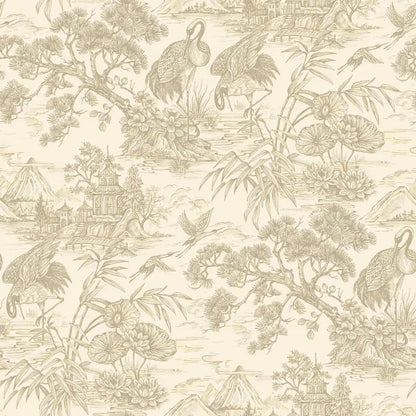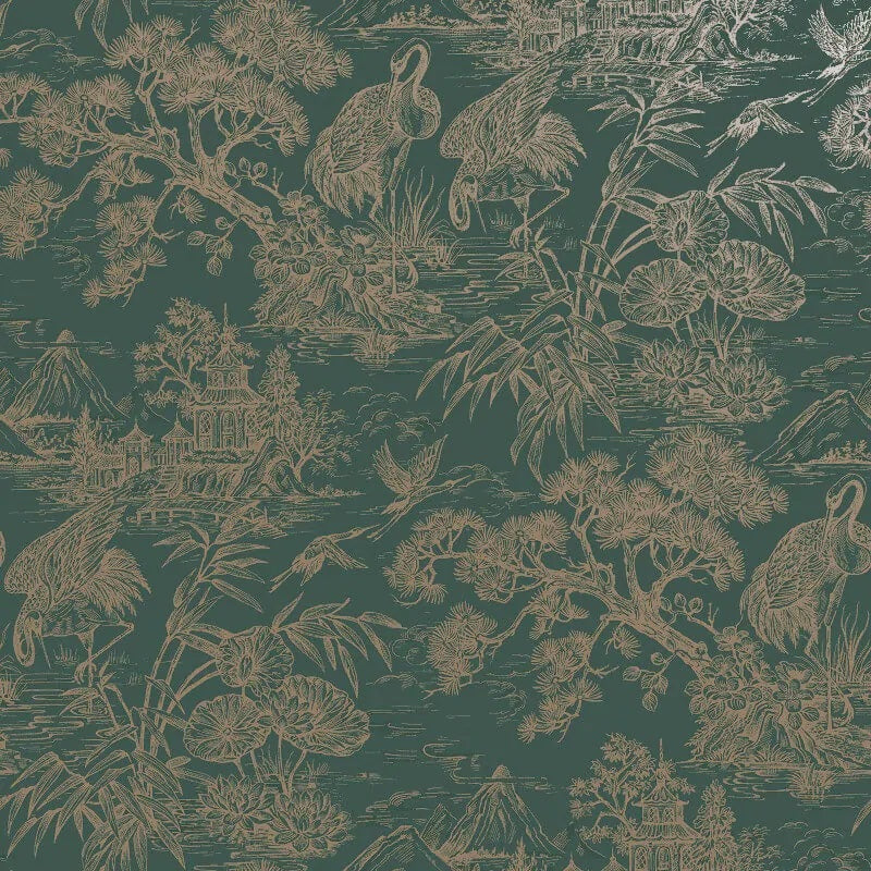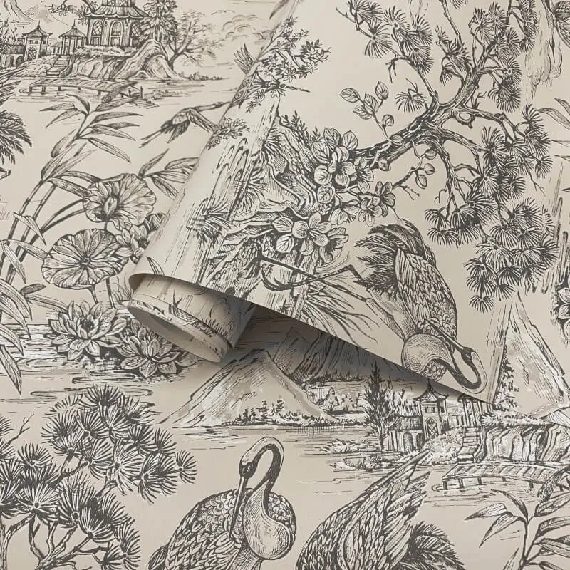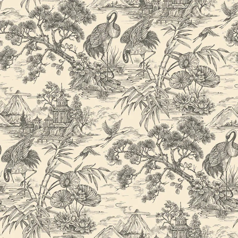 Featuring traditional Japanese influences, this oriental wallpaper includes majestic cranes flying and sitting gracefully amongst floral motifs and a picturesque Japanese scene.