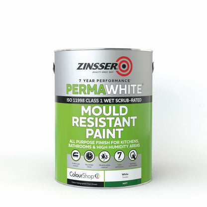 Zinsser Perma White Paint in Matt Zinsser Perma-White Matt is a self-priming paint that bonds to existing solvent-based or glossy paints. Recommended for application in high-humidity areas, like bathrooms and kitchens, as the paint film is resistant to...