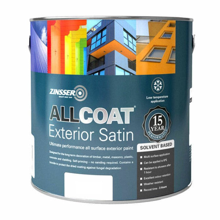 Read More...A professional quality solvent based exterior paint that offers up to 15 years of protection. Available to tint, the solvent based AllCoat Satin retains the colour brilliantly and can be used on most exterior surfaces.